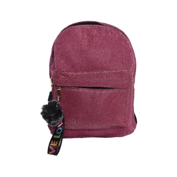 MOCHILA FEMININA BRILHOSA COM POMPOM F2037S